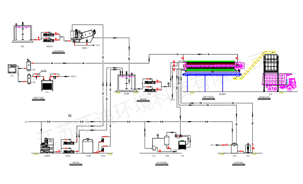 進(jìn)料系統(tǒng)由低能耗活塞式污泥泵、管道、閥組組成,經(jīng)調(diào)質(zhì)過的污泥通過進(jìn)料系統(tǒng)進(jìn)入系統(tǒng)主機(jī),污泥通過濾板、濾板過濾后的濾液通過角孔匯集到總管排放。我們設(shè)計了在線加藥系統(tǒng),污泥經(jīng)活塞泵進(jìn)料的同時,加藥螺桿泵將所需藥劑,與污泥在混合器內(nèi)完成污泥的絮凝,不同進(jìn)料階段的進(jìn)料流量、加藥流量的變化,根據(jù)流量計的顯示做調(diào)整。