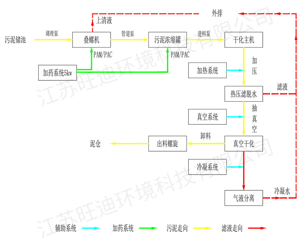 污水處理廠濃縮池中的含水率96~98%的濃縮污泥,通過污泥泵輸送至污泥調(diào)質(zhì)池內(nèi)。在污泥調(diào)質(zhì)池內(nèi)對污泥進(jìn)行調(diào)質(zhì)、調(diào)理,滿足進(jìn)料要求后,通過進(jìn)料系統(tǒng)進(jìn)入主體設(shè)備。(含水率98%,直接處理到含水率40%以下)